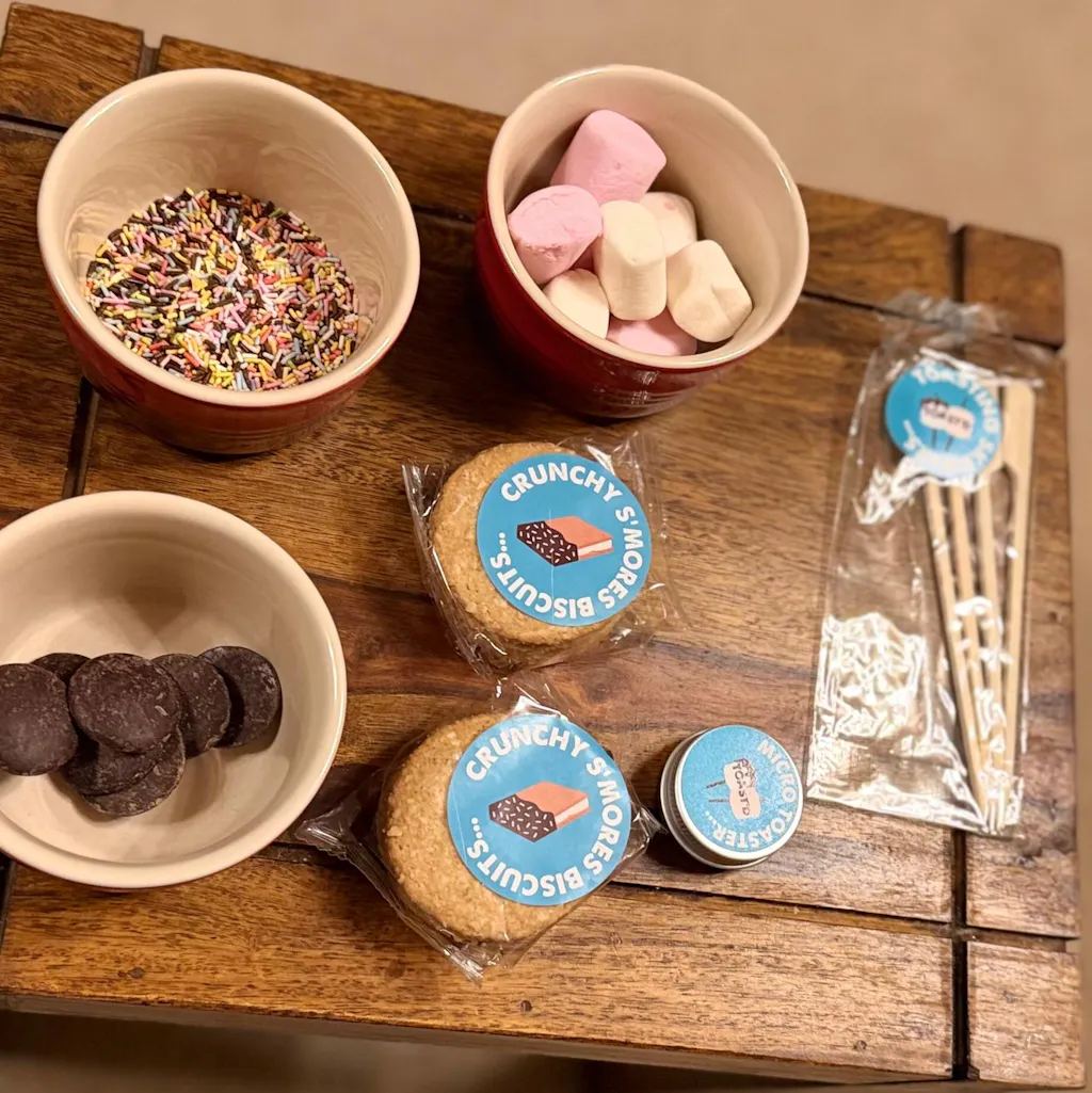 A Vegan / Halal / Gluten Free Letterbox version of our Best Selling S'mores 'N' Dip kit, with Vegan Marshmallows, Belgian Dark Chocolate drops, Coloured Sprinkles for dipping & decorating, Sweet & Crunchy Oat based S'mores Biscuits, a funky Micro Toaster, Bamboo skewers, Recipe & Instruction card.